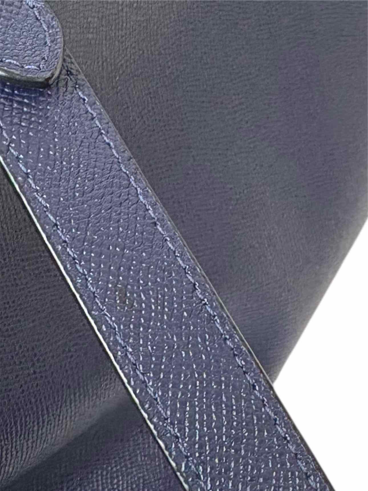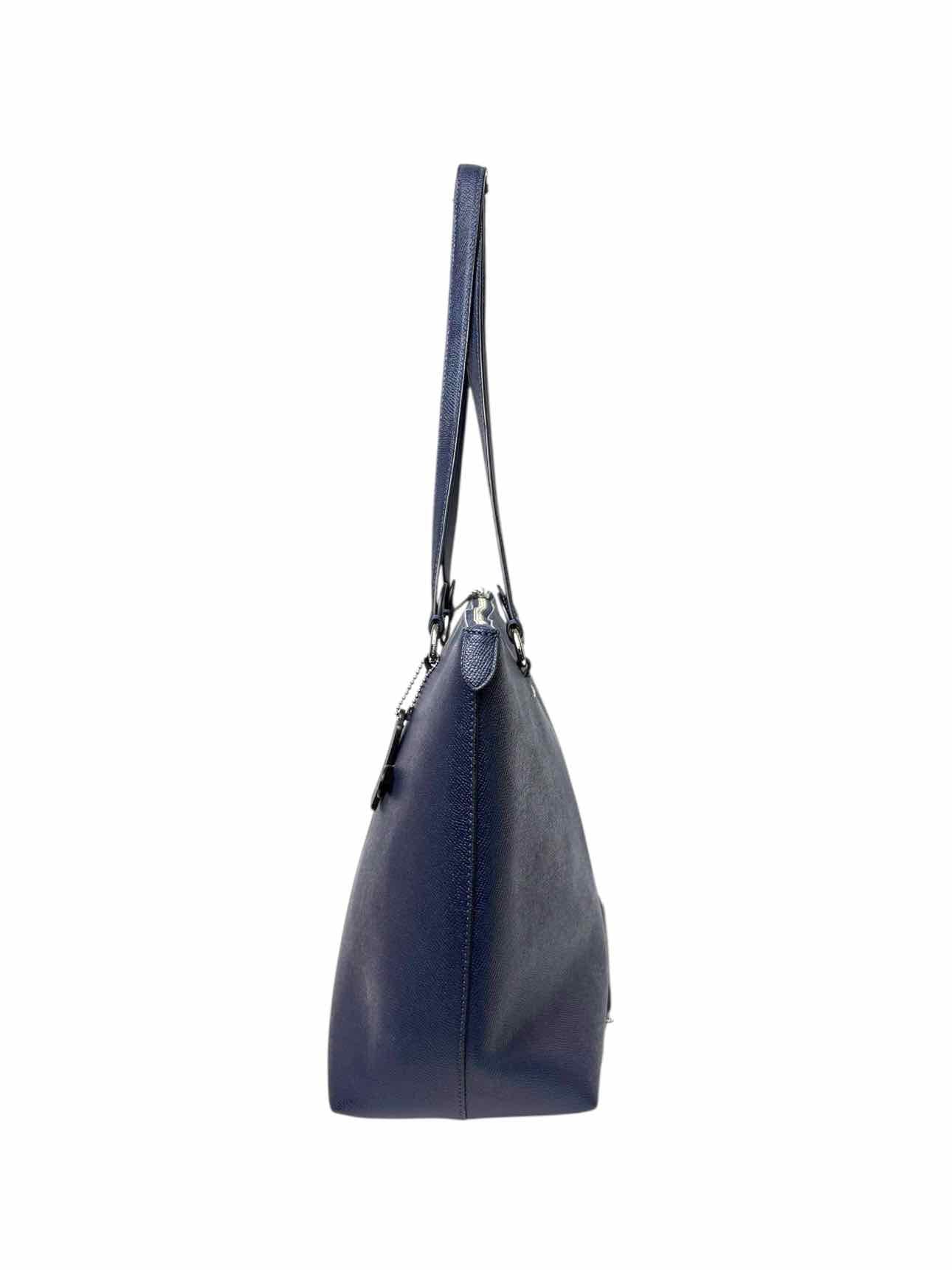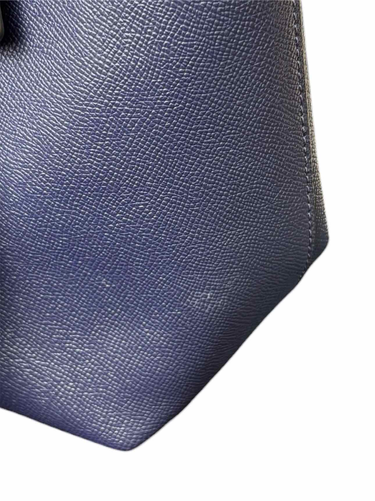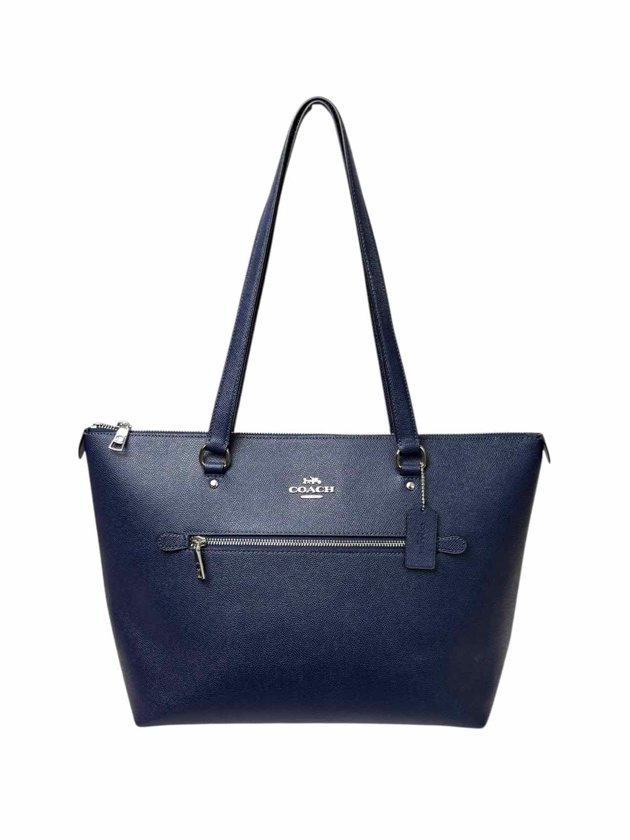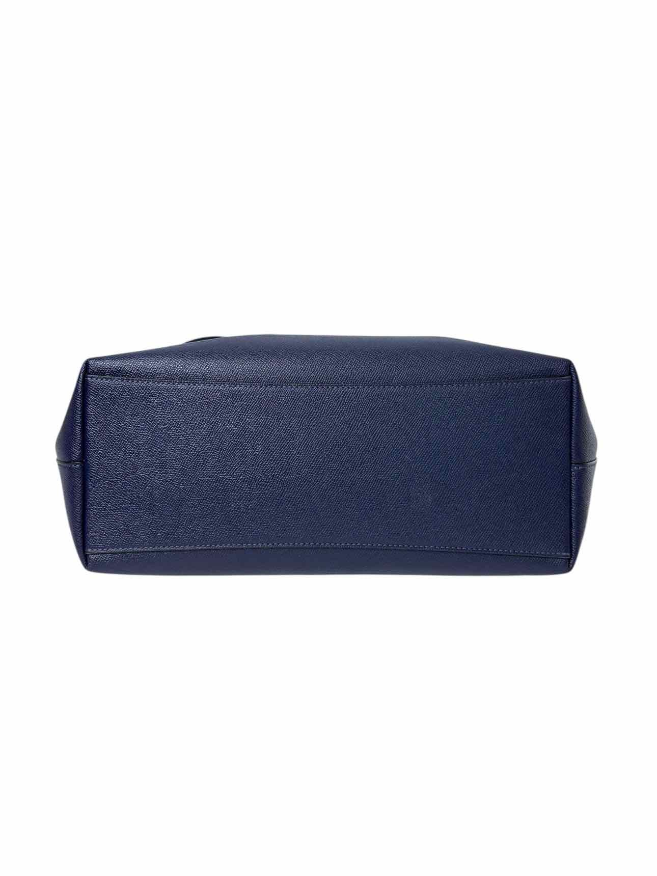 Large Top Handle Tote w/Zippers. Small mark on leather & fading on interior lining. Handles 12". 11"H x 17"W x 5"D. Silver tone hardware, 1 exterior zip pocket, 3 interior pockets (1 zip), dual leather handles, zip closure.