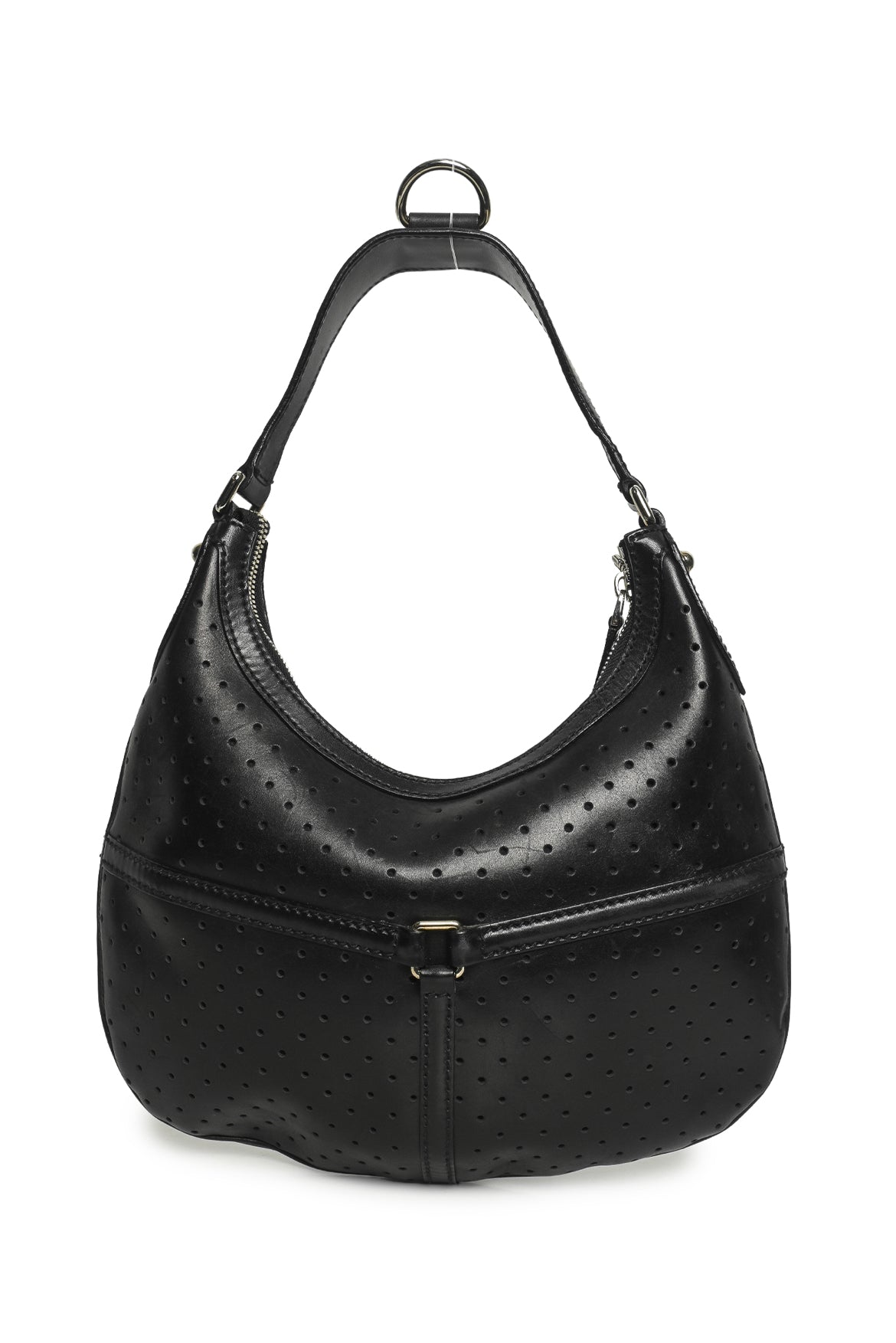 Perforated Leather Reins Hobo. 114869-3444. Relaxing in shape; scratches & wear throughout exterior; minor wear & fading at interior; cracking & wear at strap. Strap 7.75" 8"Hx12"W