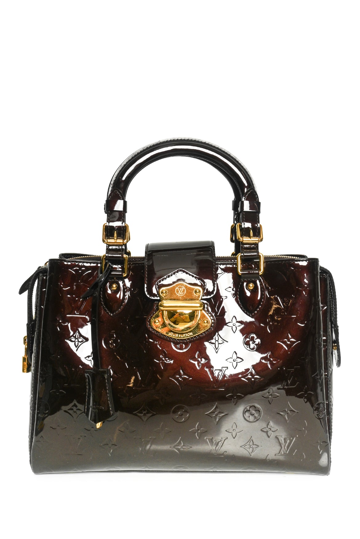 Amarante Monogram Vernis Melrose Avenue Tote w/lock & keys in clochette. VI1191. Repaired patches at corners, residue & marks throughout lining & bottom, scuffs on hardware. 10"H x 14.5"W x 5"D