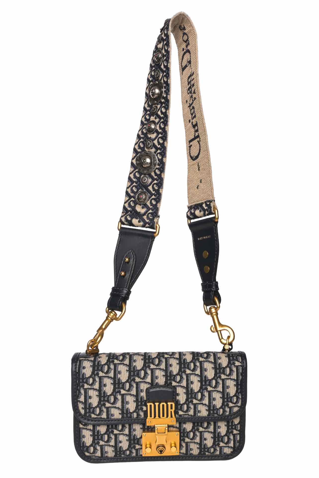 2019 Oblique DiorAddict Flap Bag w/ stud embellished strap & key. 09-BO-0119. Approx Retail $4800 CAD. Strap 17.75" 5.25"Hx8.25"Wx2"D.
