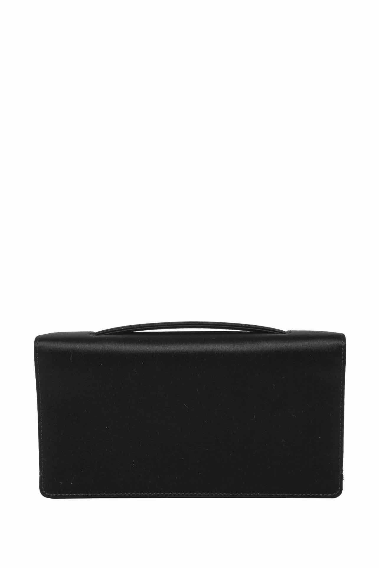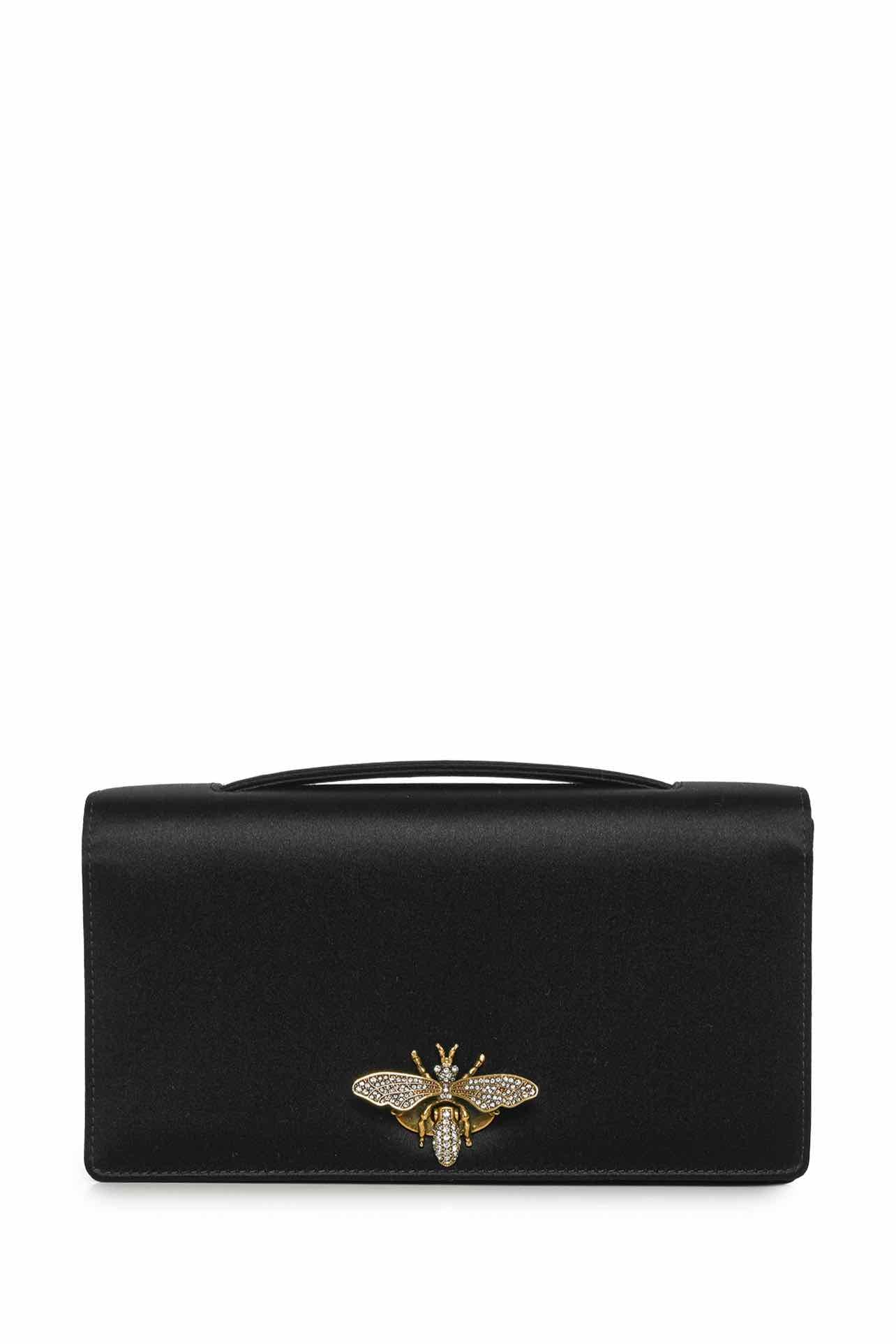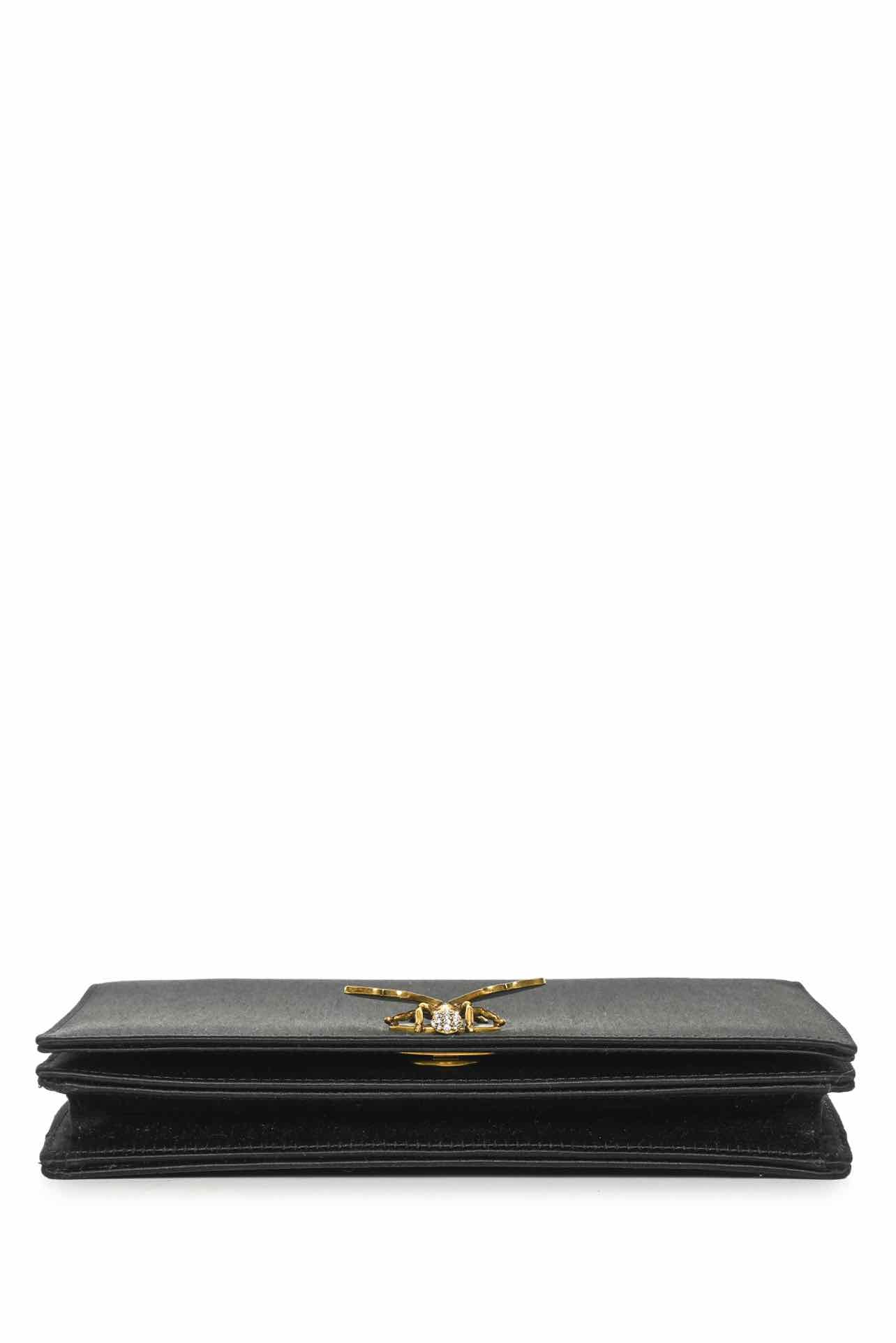 Satin D-Bee Clutch. Missing one crystal on clasp, light scuffing on hardware, faint mark on left corner. 4"H x 7"W x 1"D.