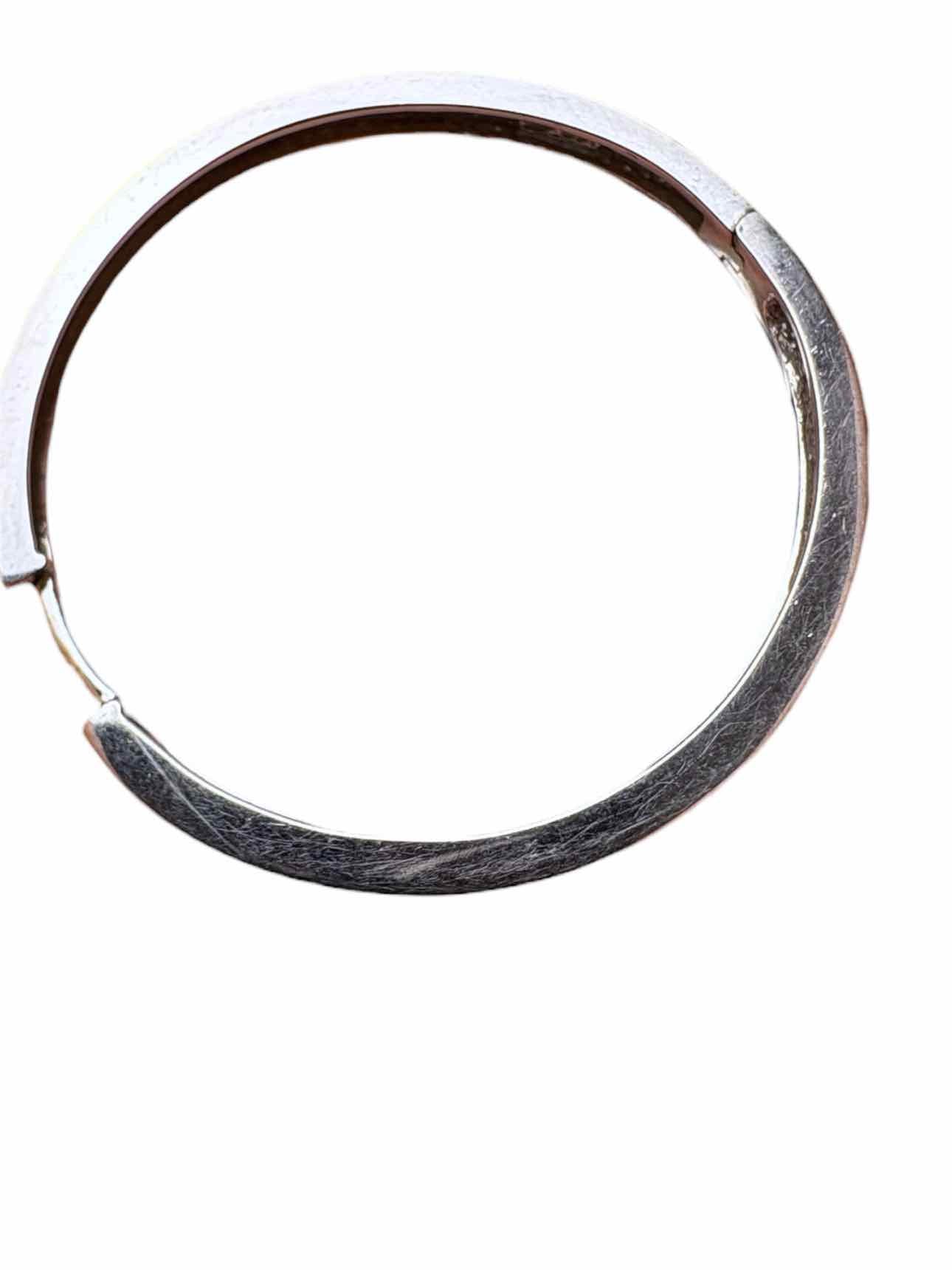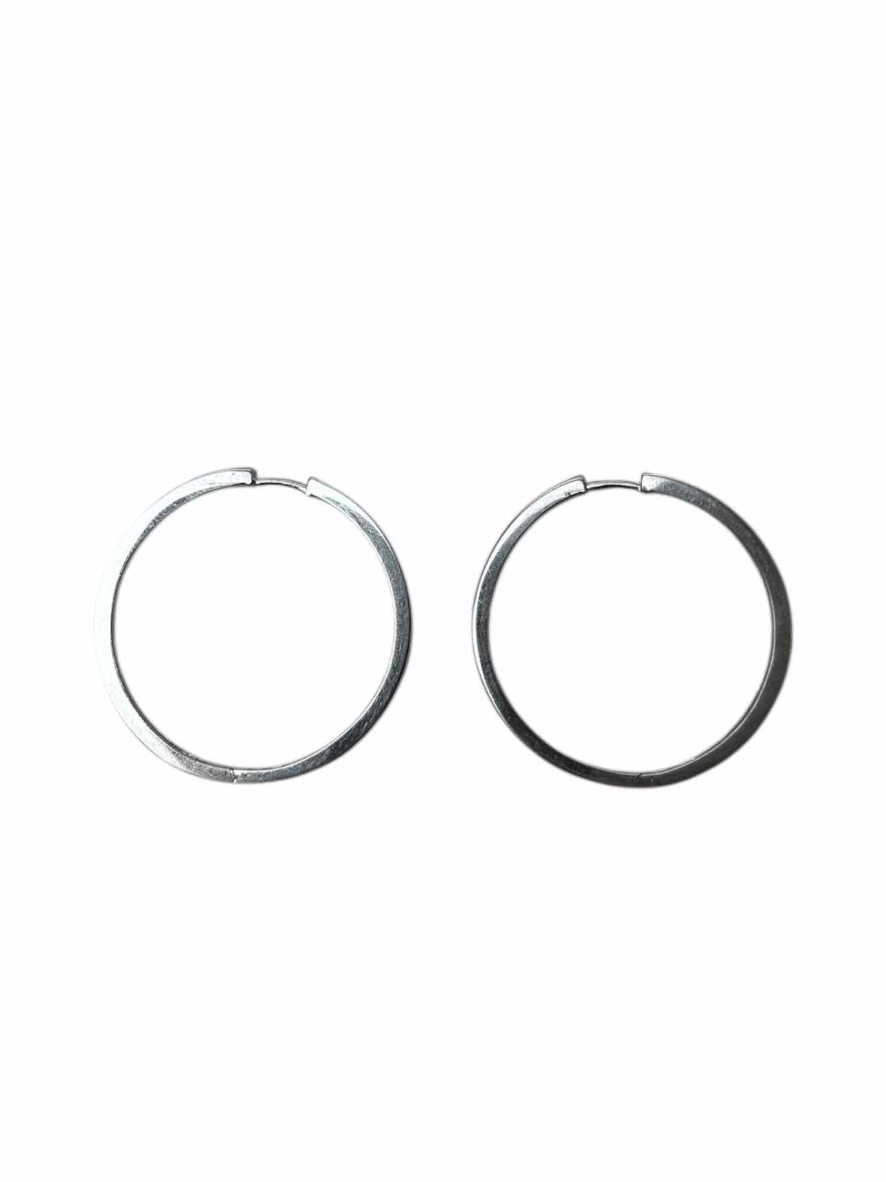 10KT white gold round diamond hoop earrings with sleeper backs. W/ box. W/appr- value $3800. 60 bead set round brilliant cut diamonds 1.60-1.50 x 0.93mm. Approx total weight 0.75ct. Color G-I, Clarity SI-2 to I-1, Cut- good. 1.25 x 1.2 As is scratches.