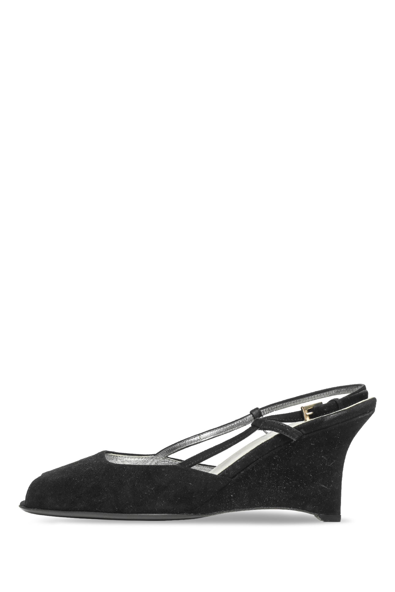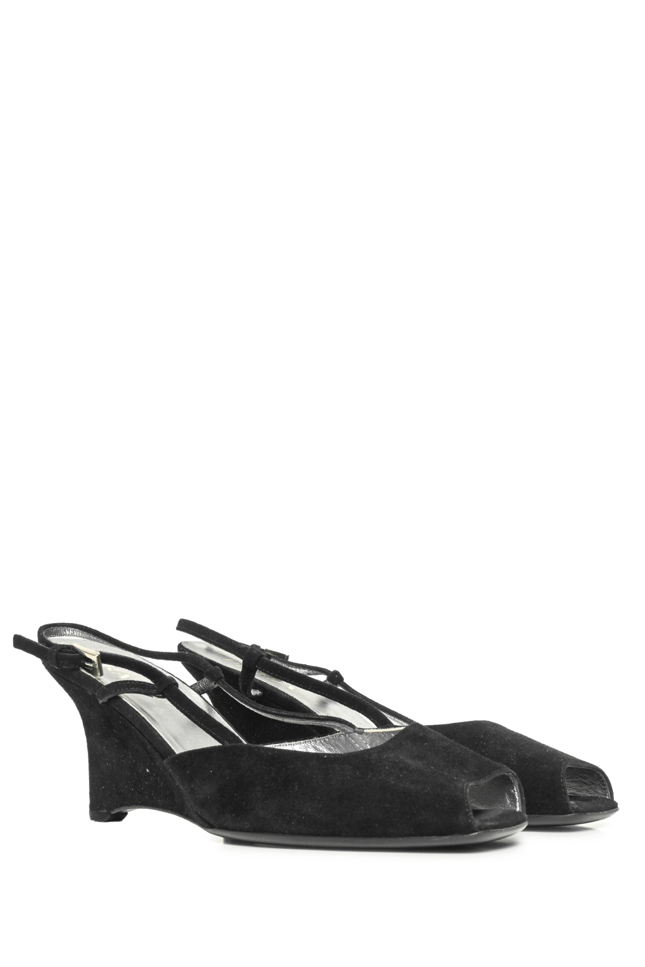 Peep Toe Suede Slingback Wedges. Minor wear throughout suede. Heel Height 3"