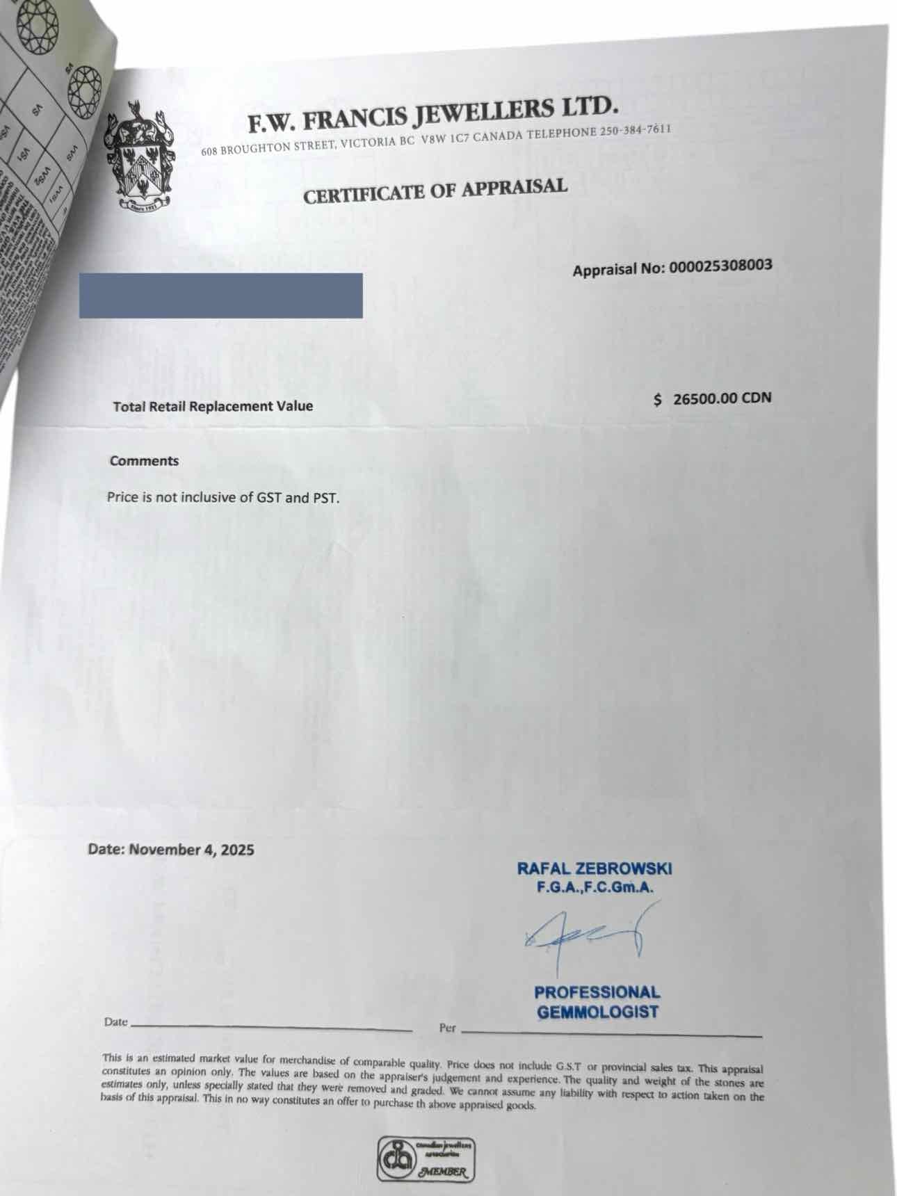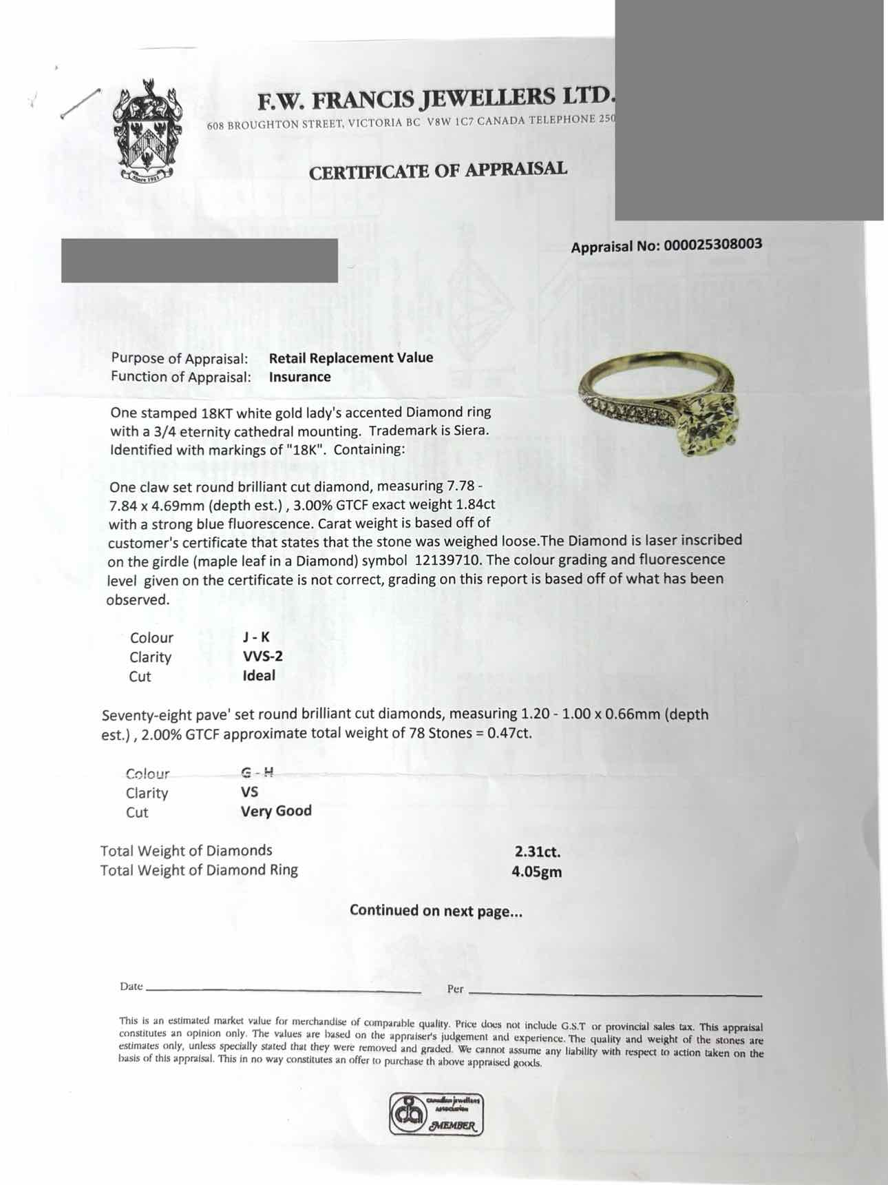 W/Lighted Box. 18K White gold diamond solitaire ring w/ appraisal. Value $26500. 1 claw set round brilliant diamond 1.84cts and 78 pave' set round brilliant cut diamonds 0.47cts total. Minor scratches on band.