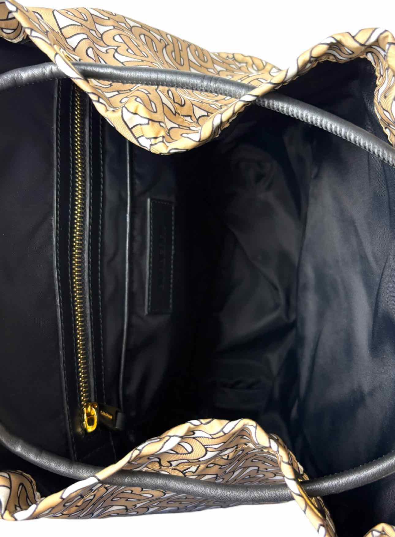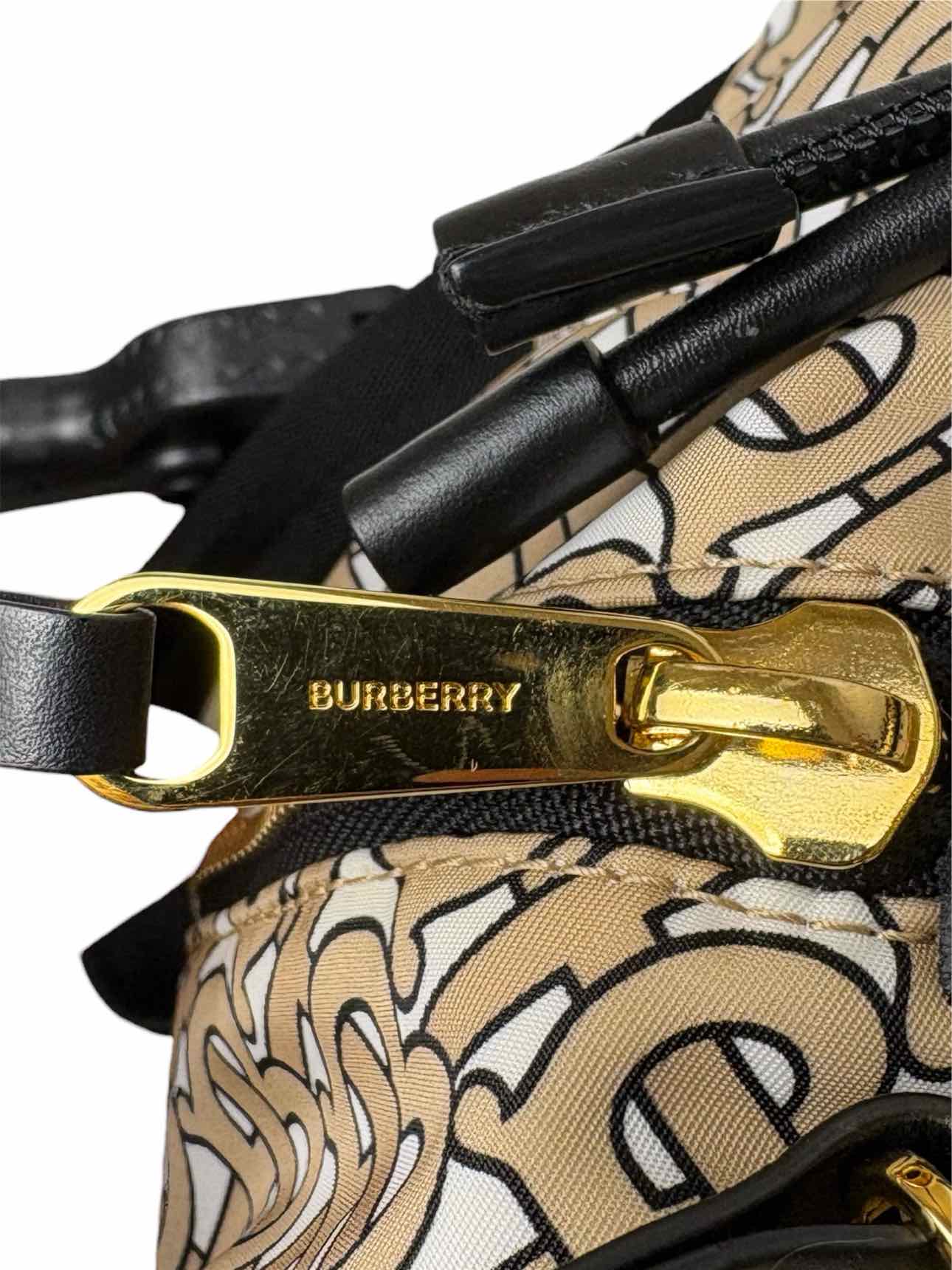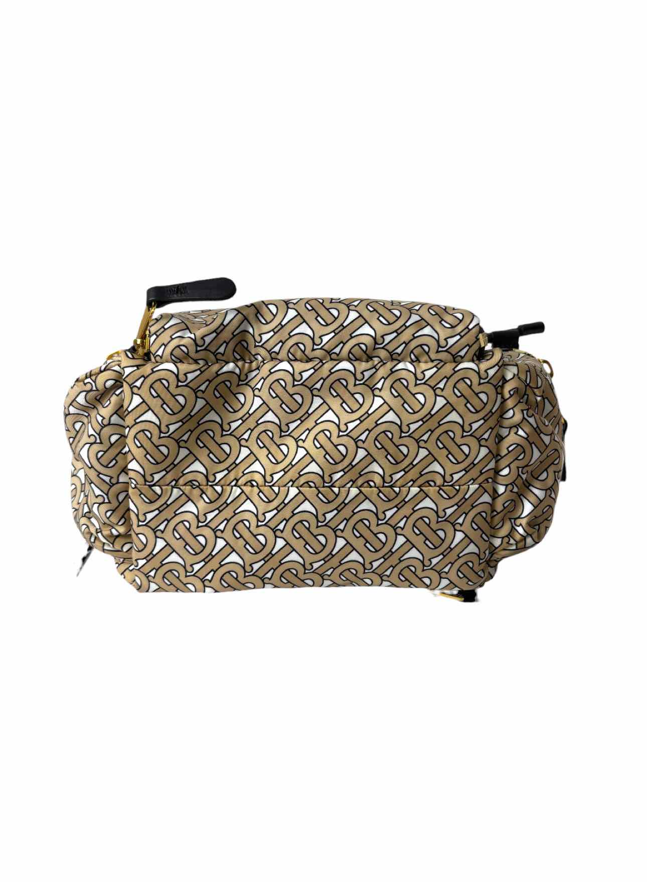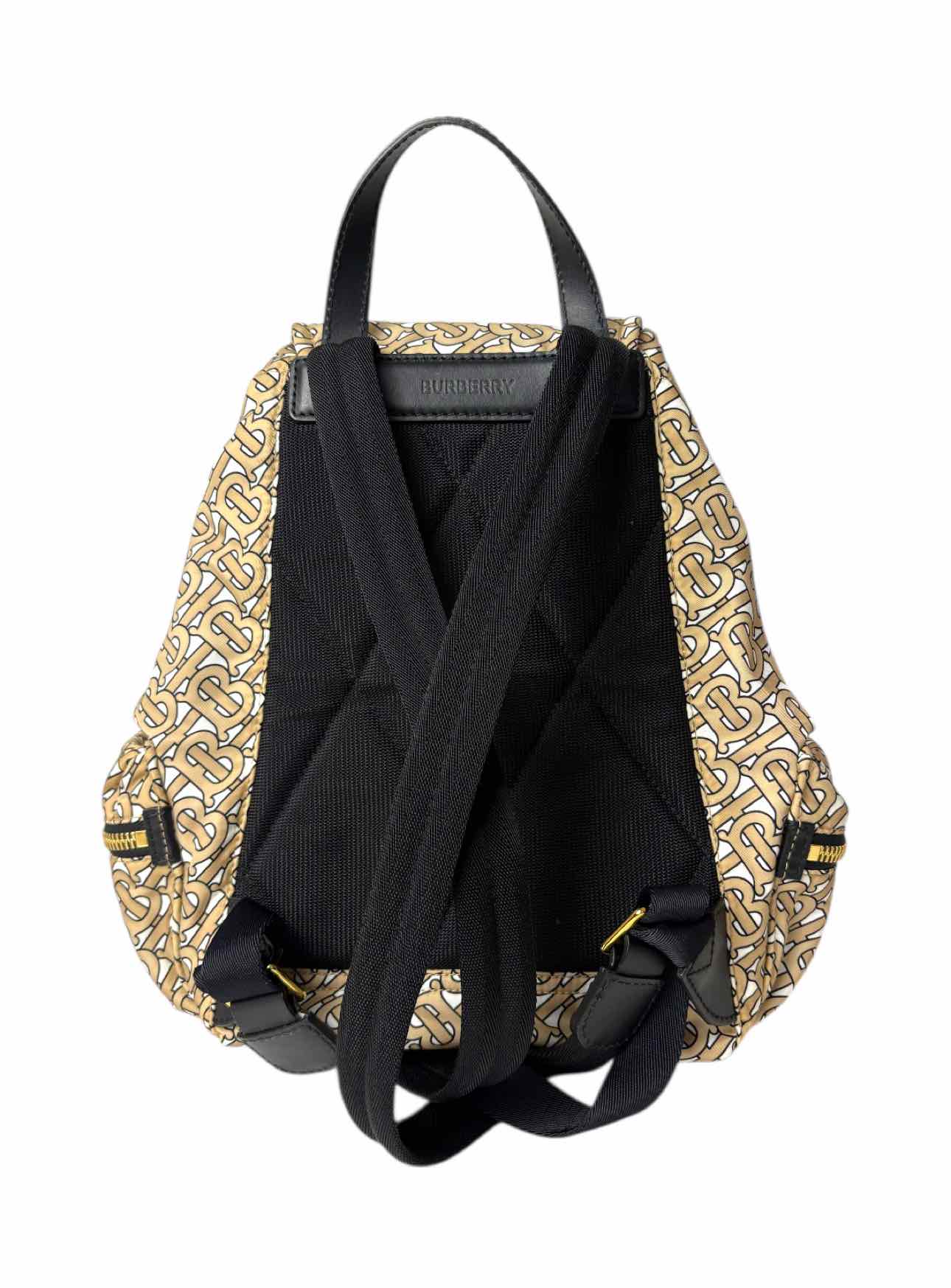 Burberry TB Monogram Nylon Backpack w/Leather Trim. Small mark on front, light scratches on hardware. 14"H x 10"W x 5.5"D. Gold tone hardware, 3 exterior zip pockets, 2 interior pockets (1 zip), adjustable nylon straps, snap & cinch closure.