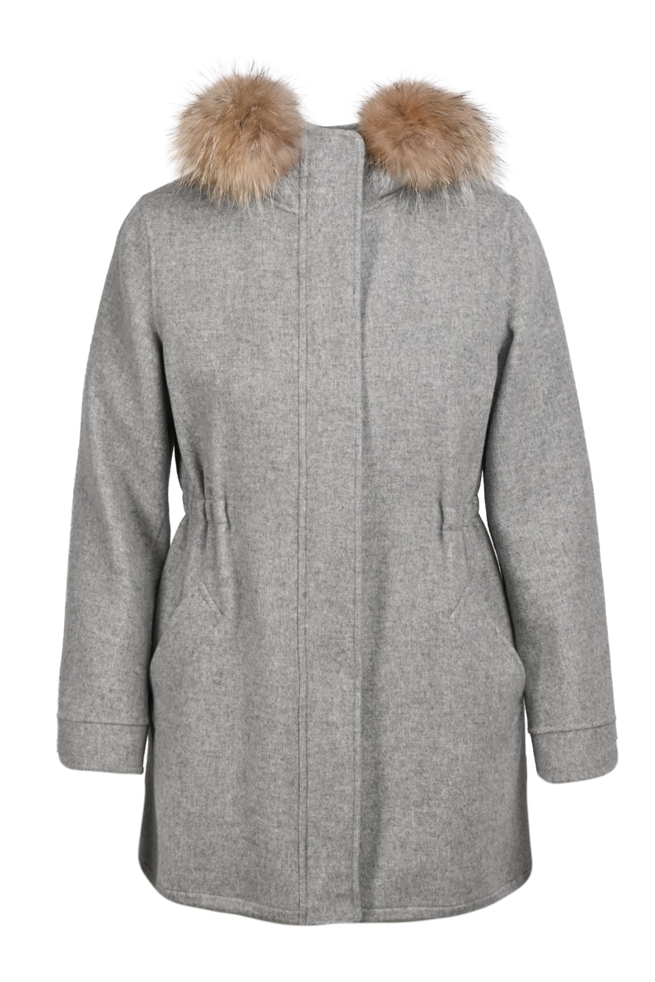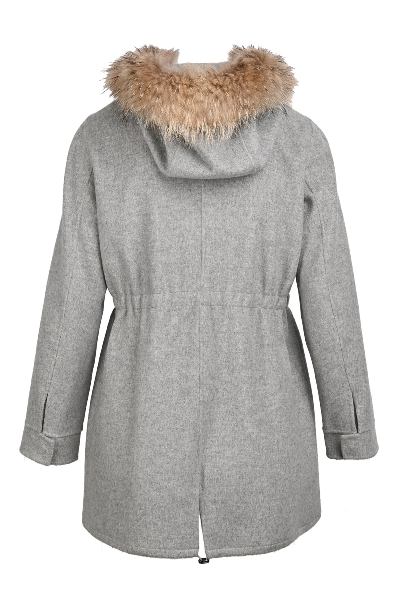 Cinch Waist Coat w/ Racoon Fur Trim.