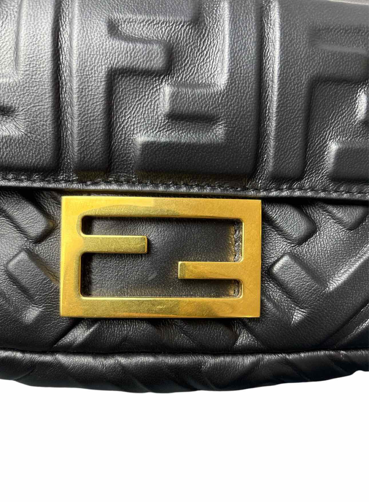 Fendi Mini Baguette w/Removable Straps. Comes w/Dust Bag & Box. Small marks on leather & wear hardware. Handle 2.5". Strap 22". 7.5"H x 5"W x 1.5"D. Gold tone hardware, 1 interior pocket, chain strap&leather handle (both removable), magnetic snap closure.