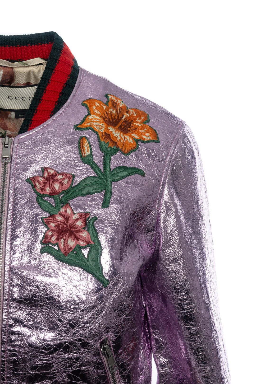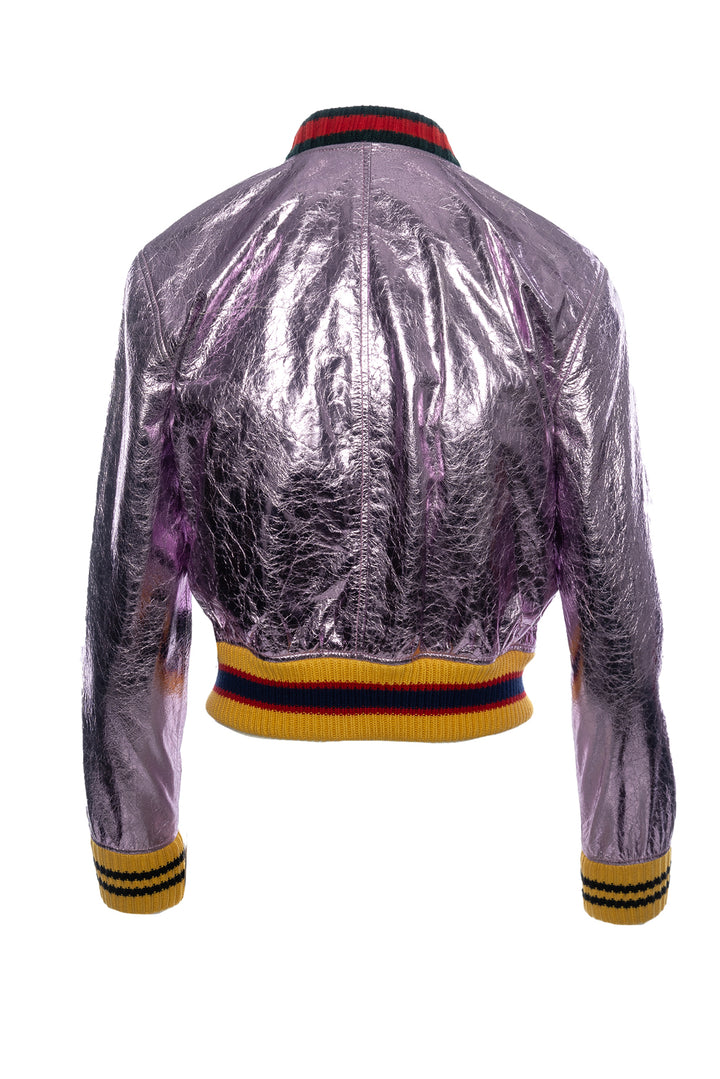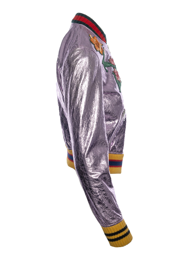 Gucci Size 40 Embroidered Metallic Leather Bomber Jacket