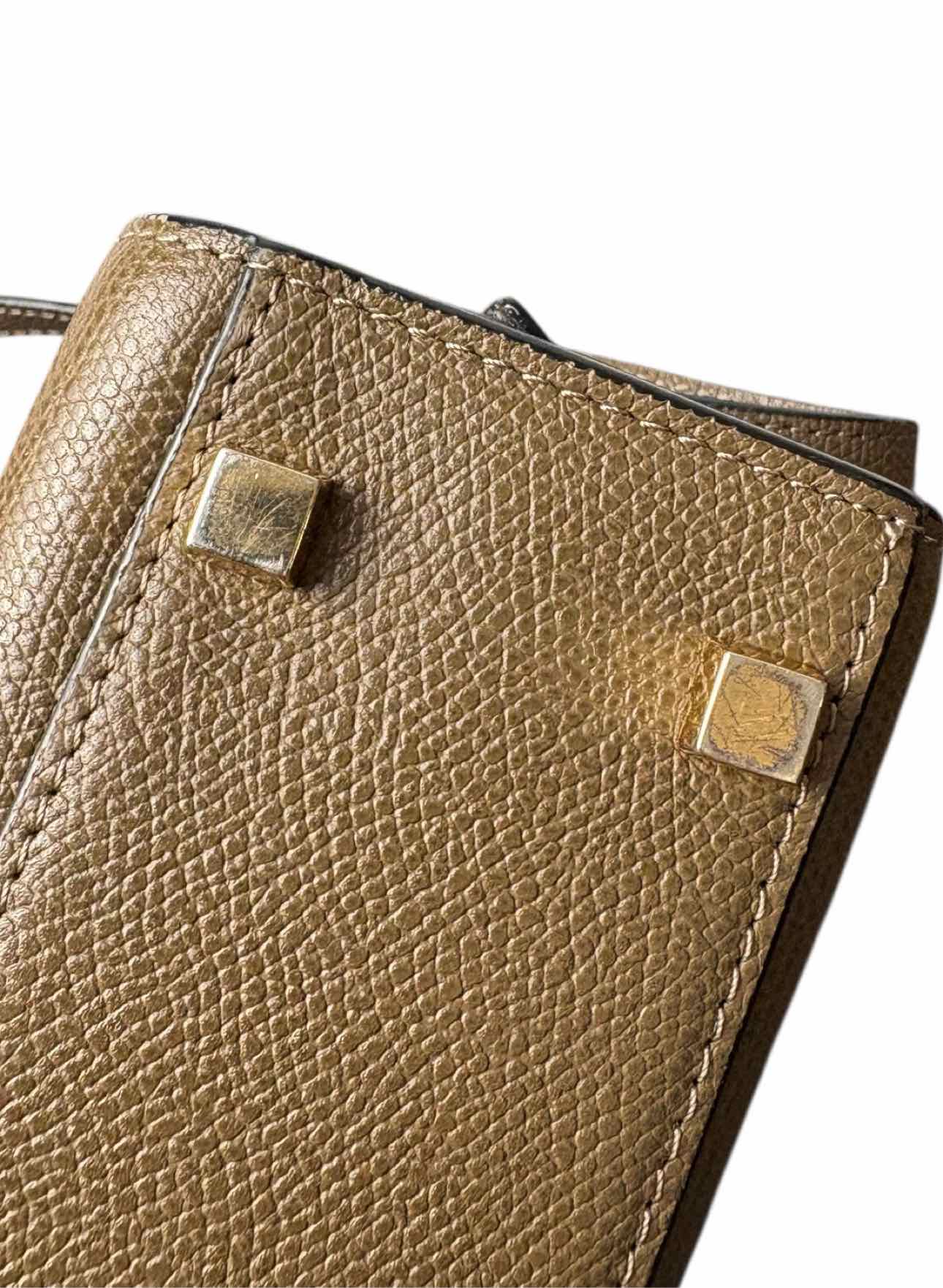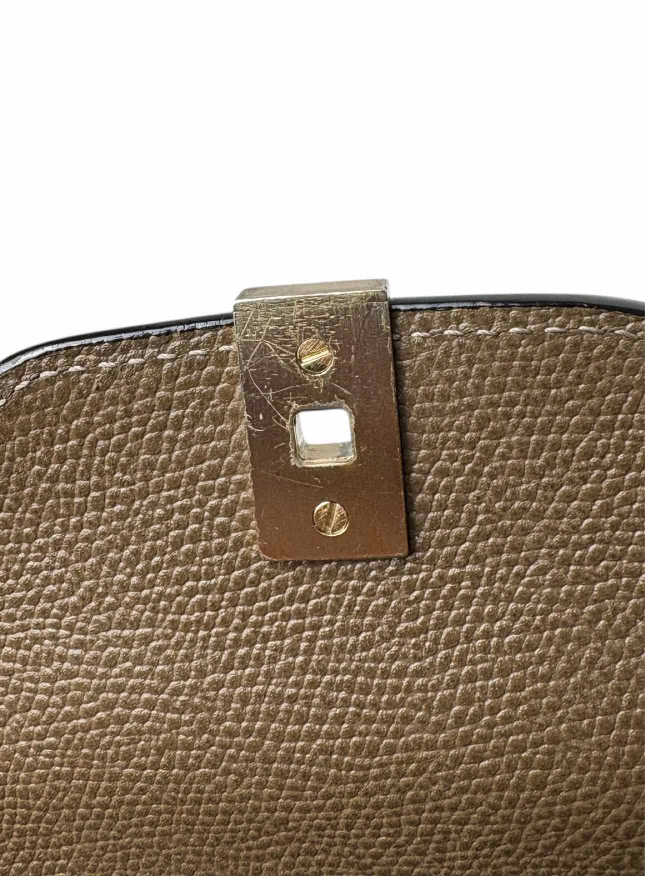 Valextra Iside Top Handle Mini Crossbody Bag. Scratches/wear on metal, marks on interior/leather, peeling leather on strap. Strap 20.5". Handle 2". 5"H x 7"W x 2.5"D. Gold tone hardware, 1 int. pocket, top handle, adjustable flat strap, clasp closure.